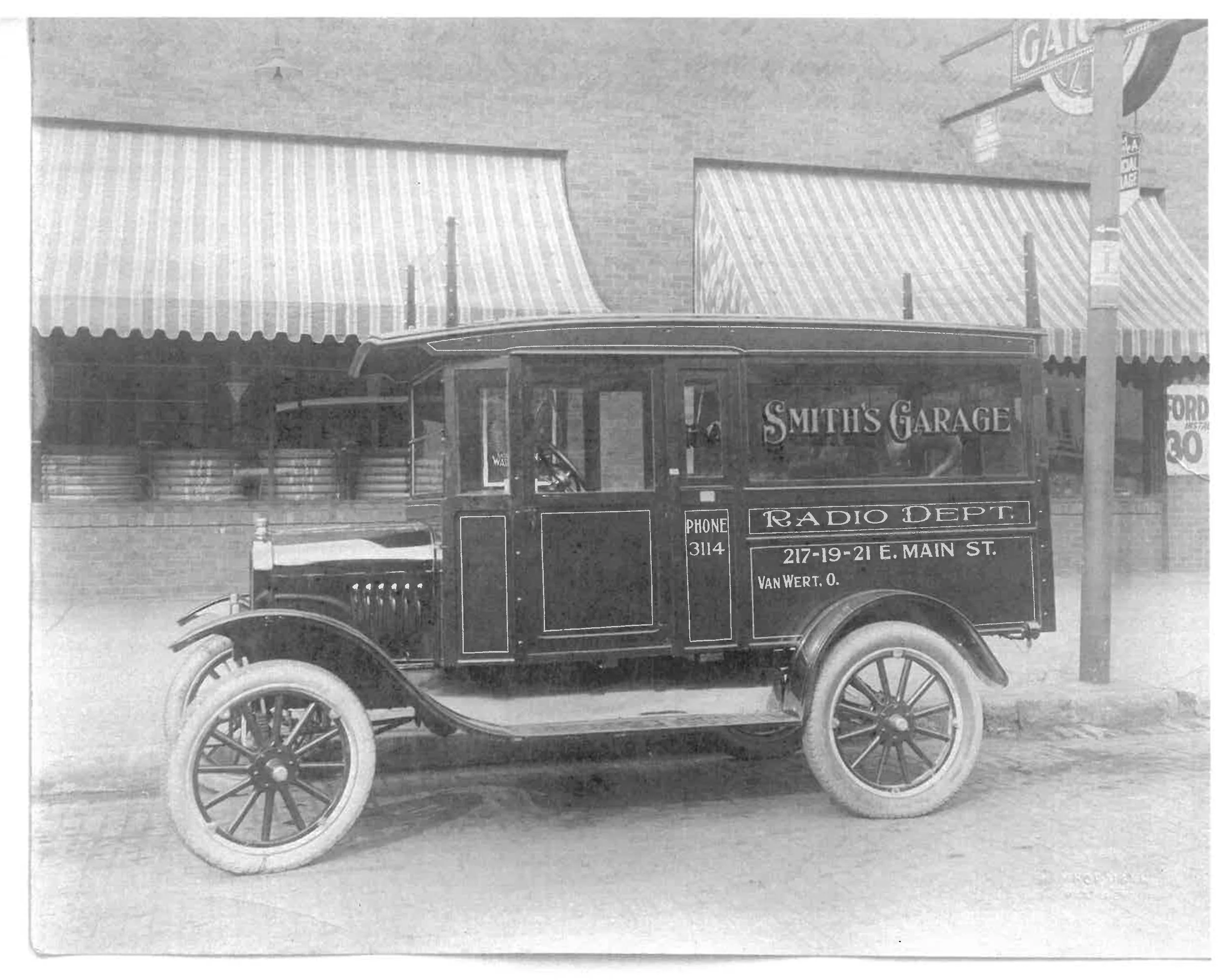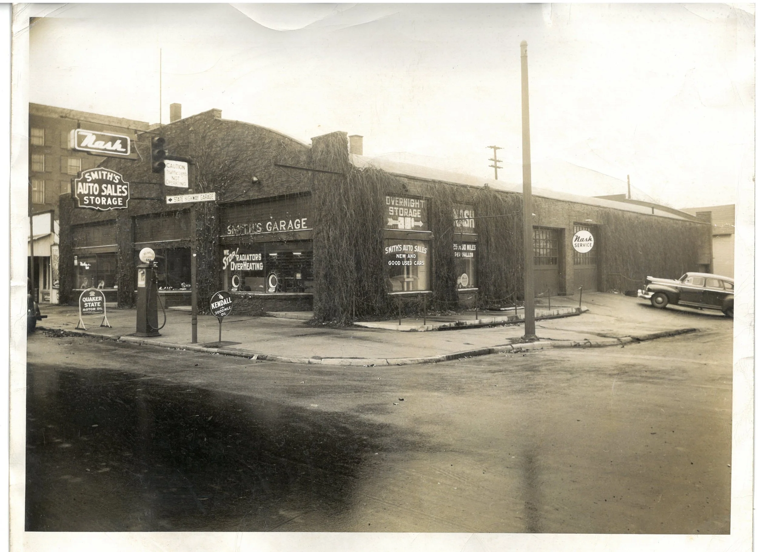 Built in 1920, this building was originally home to Smith Garage, owned by Russell Smith. Russell originally worked as a mechanic at the Bonnewitz Brothers Garage on corner of E. Main and Market Streets (location of Mengerink’s Sporting Goods) and later operated an Auburn dealership in Gunsett’s Mule Barn on S. Market Street. He then went on to build his own dealership selling Auburn, Nash , and Buick automobiles over the years. One of the most unique features of the building is a ramp going from the street to the basement level where cars would drive for maintenance - a feature that has been maintained during renovation. The basement served as overnight storage for cars, including indoor parking for guests of the Marsh Hotel. Later a boxing ring was constructed in the basement, allowing a place for Russell’s son Lloyd “Porky” Smith, a boxer on the Golden Glove circuit, to train. Russell was also an avid gardener and included his love for gardening in the landscaping of the dealership. He was even known to cross breed roses and create new varieties.